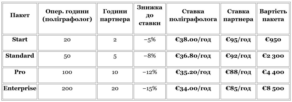 Що входить у години: бриф/ТЗ, формулювання запитань, інструктаж, інтерв’ю, проведення тесту, аналіз поліграм, висновок, базова координація; години партнера — методологія під кейс, складні інциденти, презентація керівництву, юр./комплаєнс-питання.