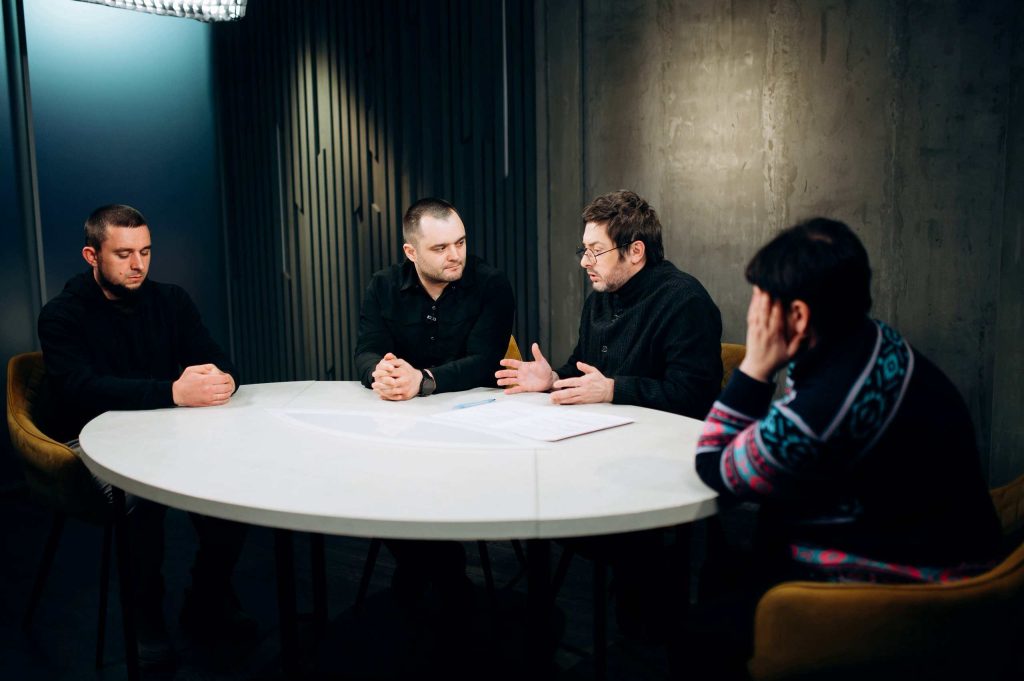 Експерт-поліграфолог Ігор Іщук, ведучий Олексій Суханов та герої чергового випуску “Говорить вся країна”