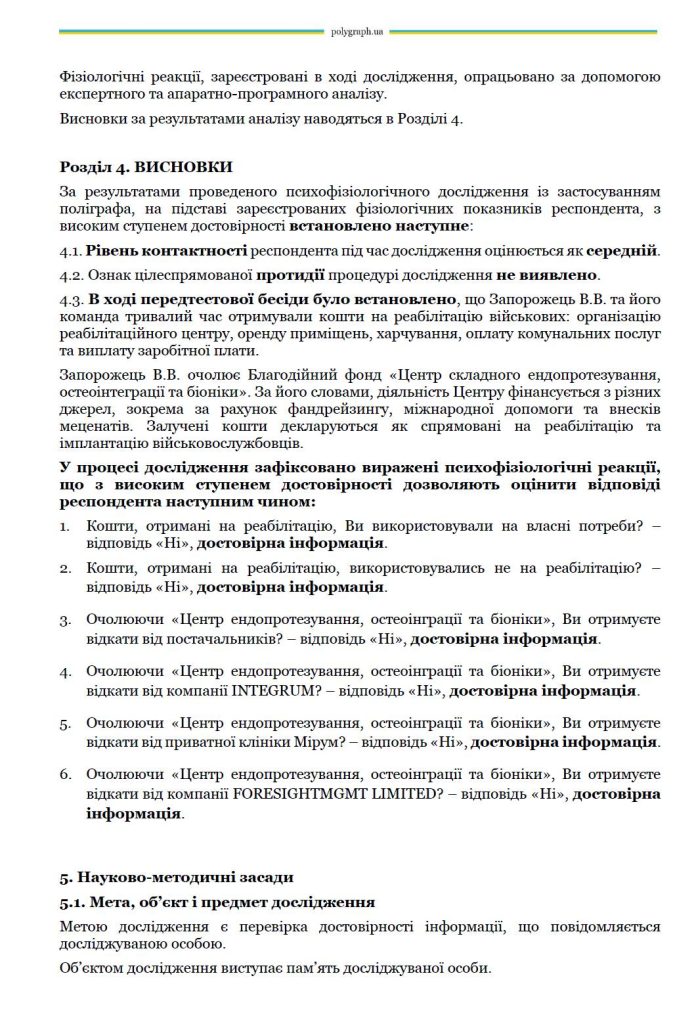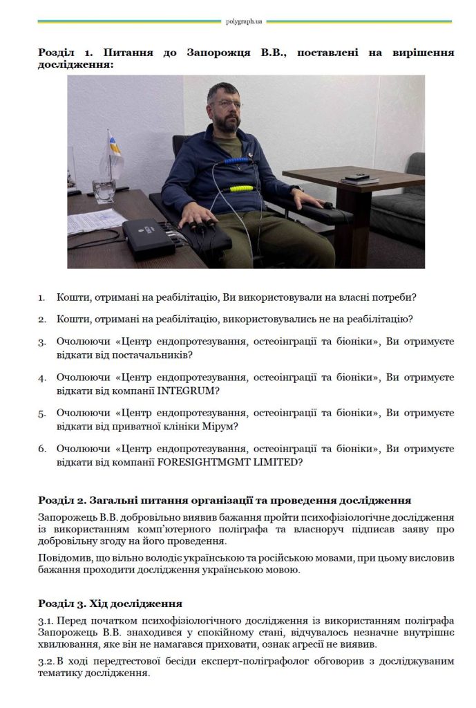 У Національній асоціації поліграфологів України та Об’єднанні експертів-поліграфологів «Ведмідь, Іщук та партнери» відбулося поліграфологічне дослідження відомого волонтера, засновника центру «Титанові» (Tytanovi Rehab) та керівника Центру ендопротезування, остеоінтеграції та біоніки В’ячеслава Запорожця.