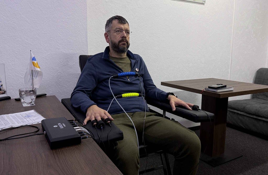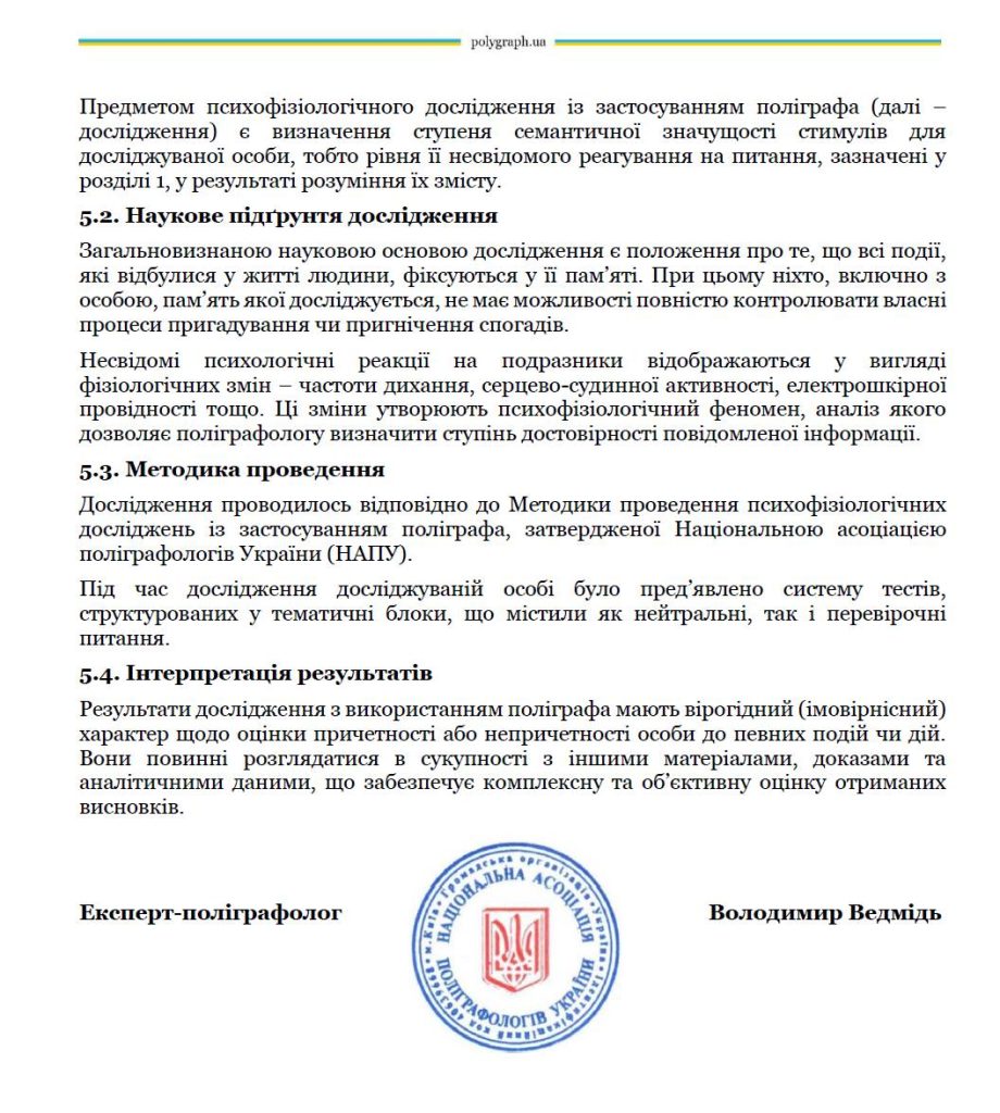 Дослідження проводив Голова НАПУ, експерт-поліграфолог Володимир Ведмідь із застосуванням сертифікованого обладнання – найсучаснішого 10-канального українського поліграфа RUBICON та методик відповідно до професійних стандартів НАПУ.